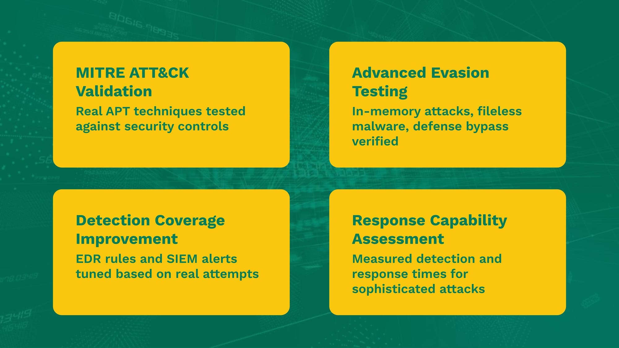 EDR rules were tuned based on real evasion attempts, SIEM alerts were refined, and incident response playbooks were tested against actual attack techniques. The organization gained measurable confidence against nation-state threats.